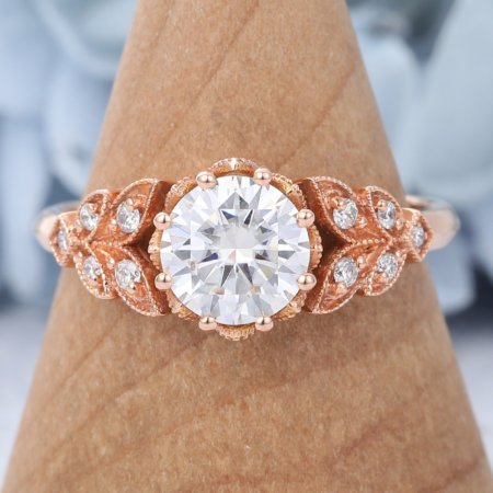 This round moissanite ring features a classic eight-prong design, securing the center stone to a rose gold leaf-shaped antique band set with small moissanite stones, exuding both vintage elegance. If your girlfriend appreciates vintage-inspired jewelry, this ring is a must-have.
