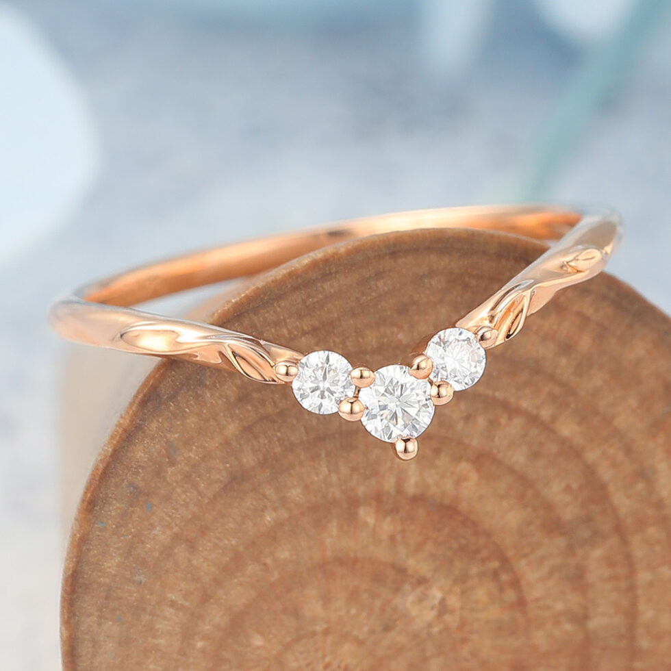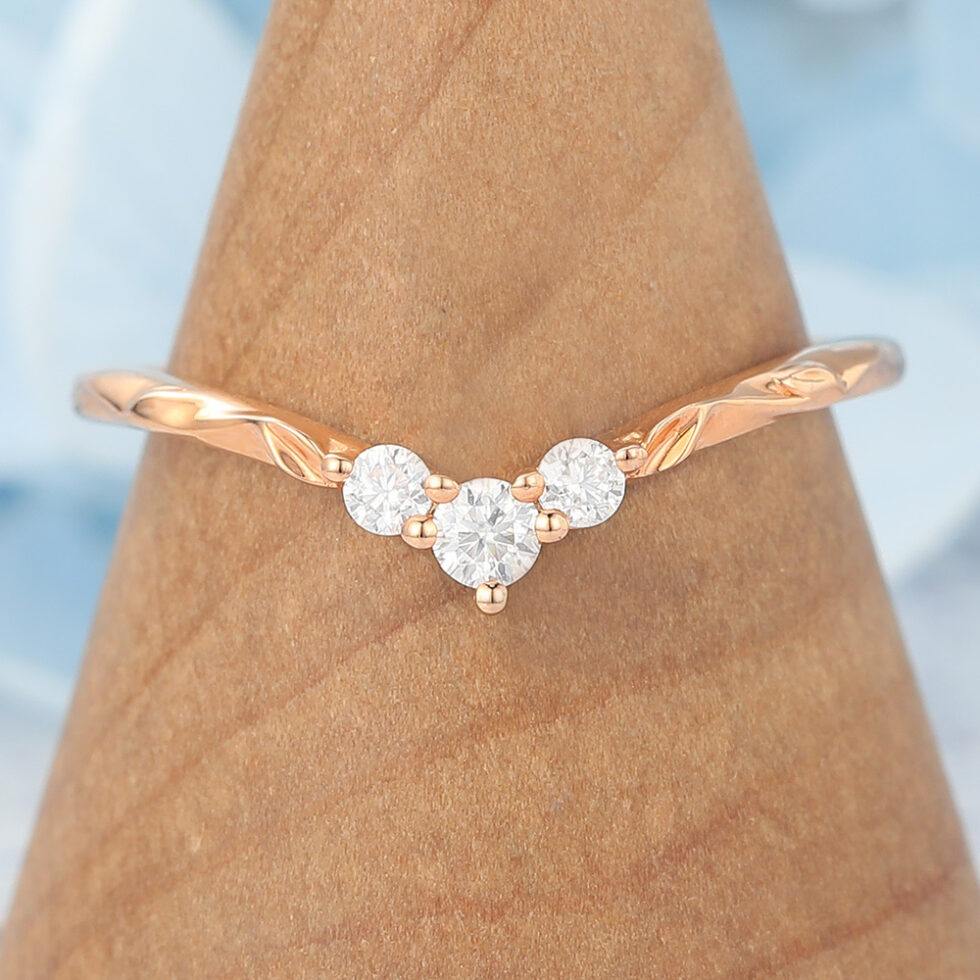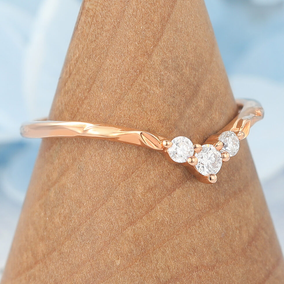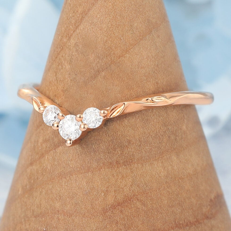 This simple Curved Wedding Band with Round Moissanite Cluster & Leaf Details showcases a sparkling cluster of round moissanites paired with intricate leaf details, capturing the beauty of nature in a timeless design. The gentle curve makes it perfect for stacking with an engagement ring, while the organic accents add a romantic and symbolic touch. Representing growth, harmony, and everlasting love, this band is a meaningful and unique ring choice for brides who want both brilliance and artistry in their wedding jewelry.