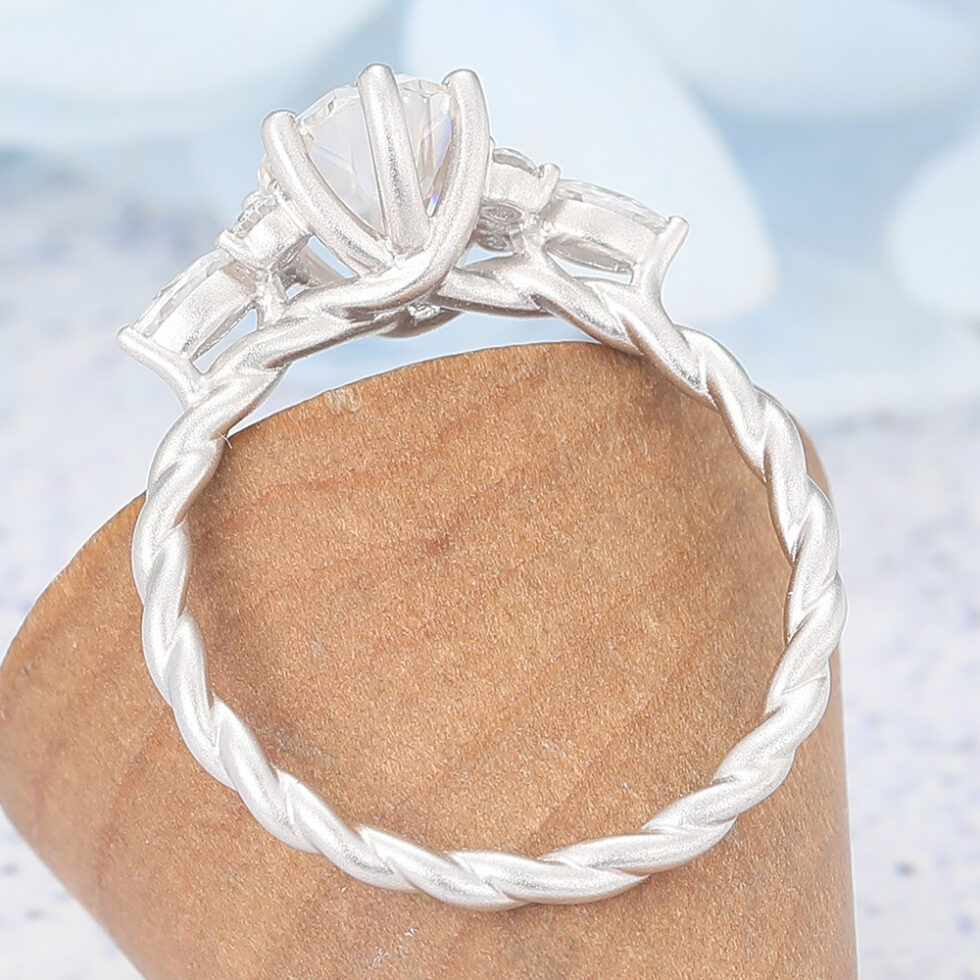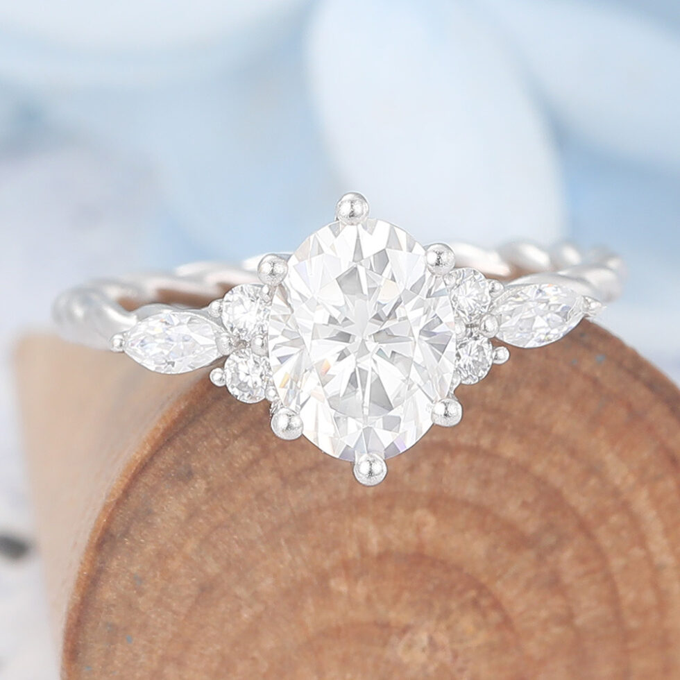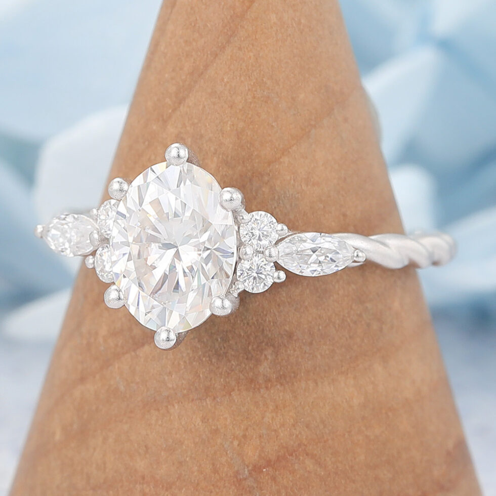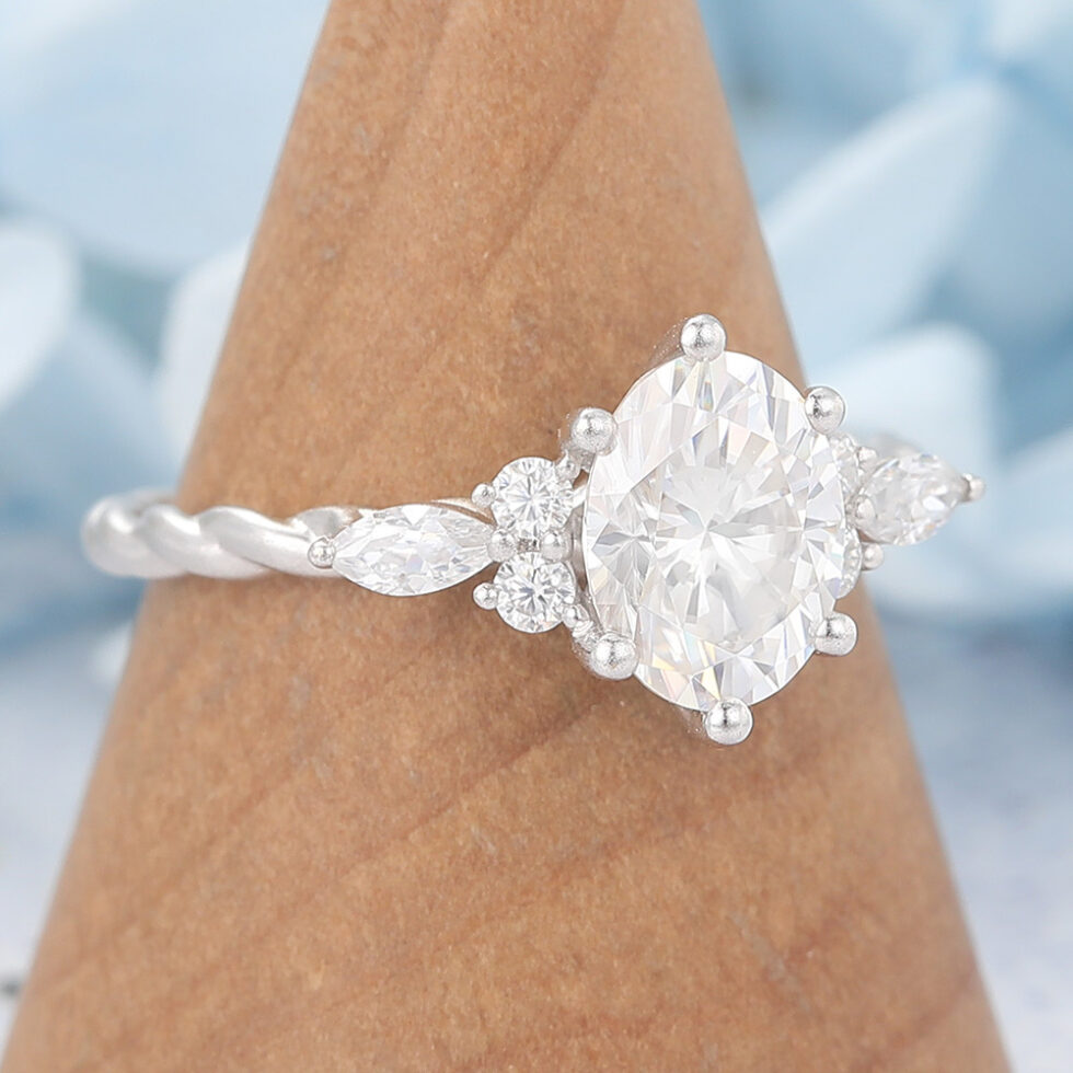 Matte Finish Oval Cut Moissanite Engagement Ring Full Twisted Band features a classic oval-shaped moissanite and some natural diamonds cluster design on two sides on the white gold band, showing a unique and antique moissanite and diamond engagement ring promise ring anniversary ring for ladies and women and wife.
