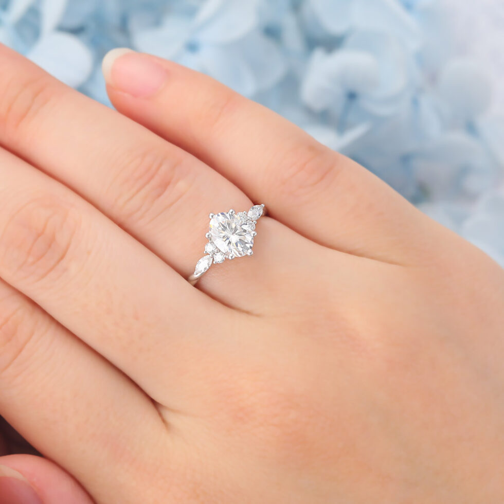 As an delicante women’s white gold engagement ring under $500, the Oval Cut Moissanite Engagement Ring combines moissanite and dimaond in a cluster, elegant and delicate.