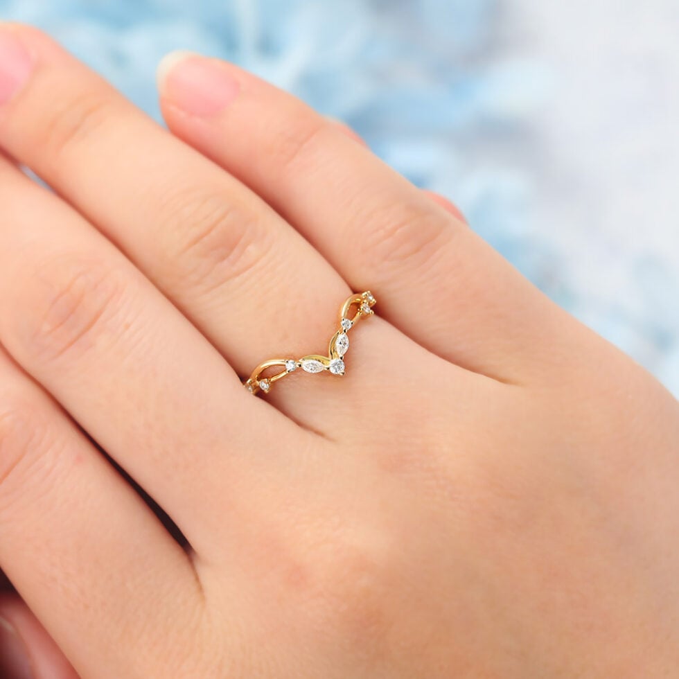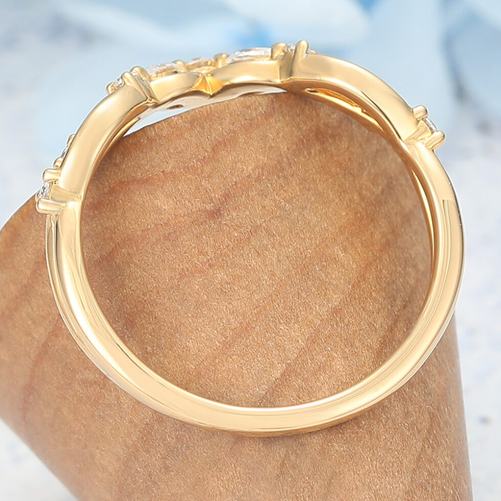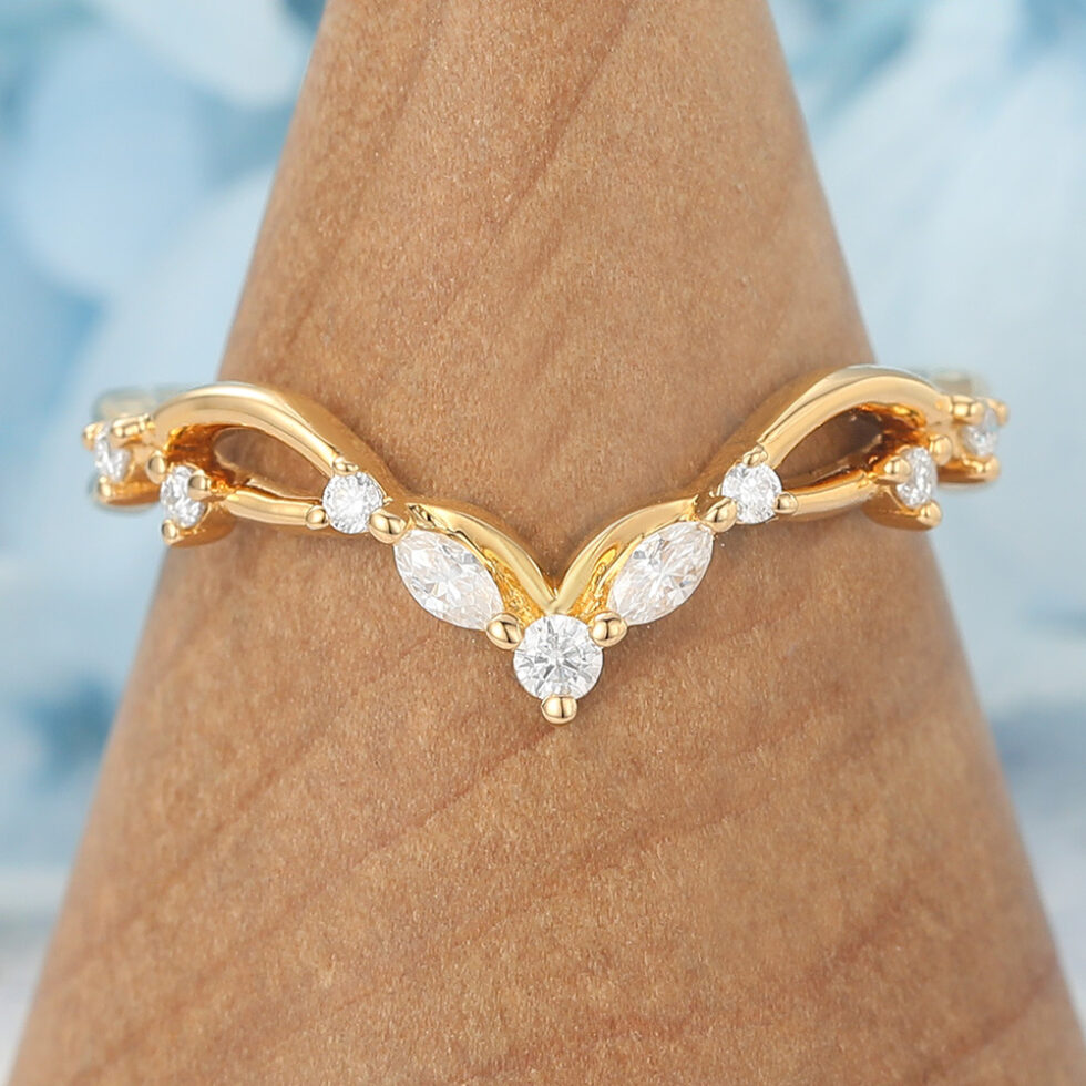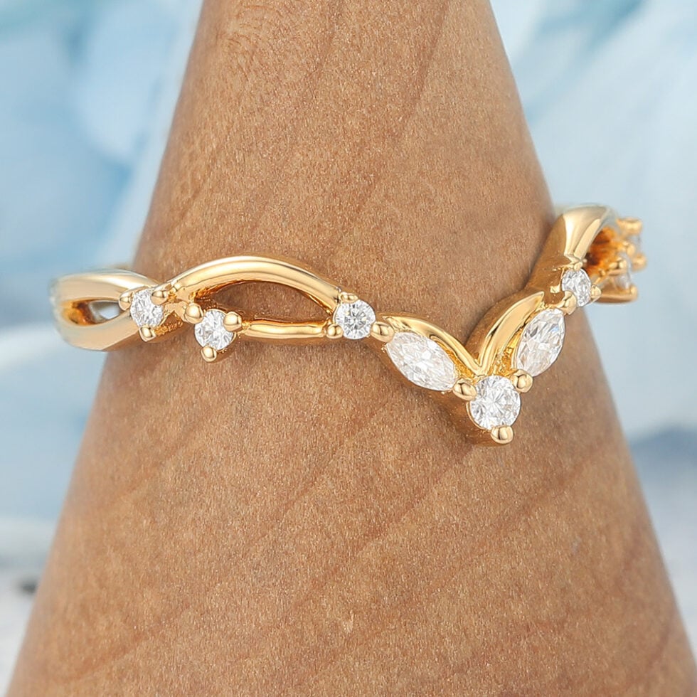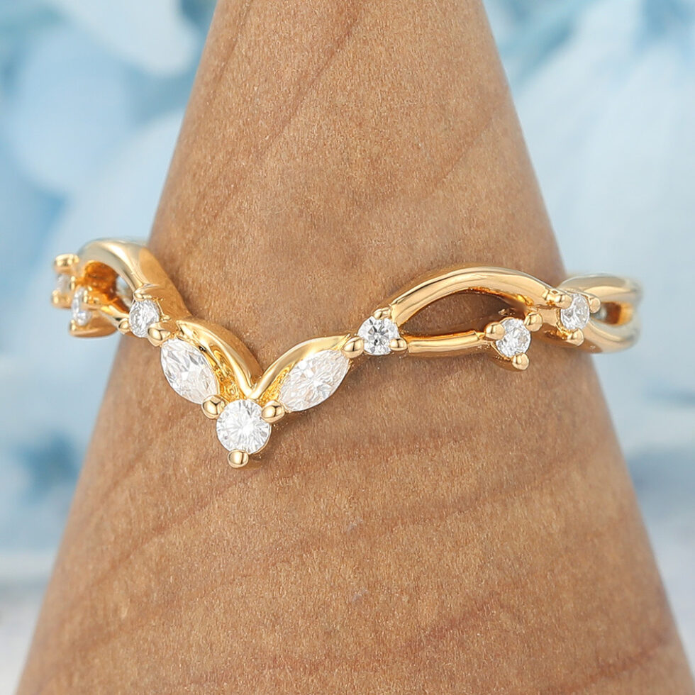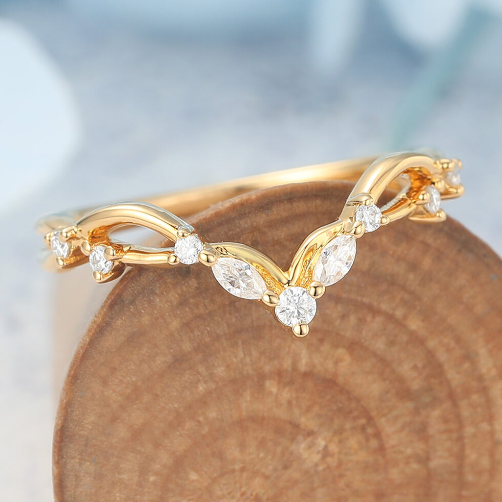.Moissanite Curved Wedding Band features hollow design , yellow gold band and marquise -shaped moissantie, which is a unique simple wedding ring for women.