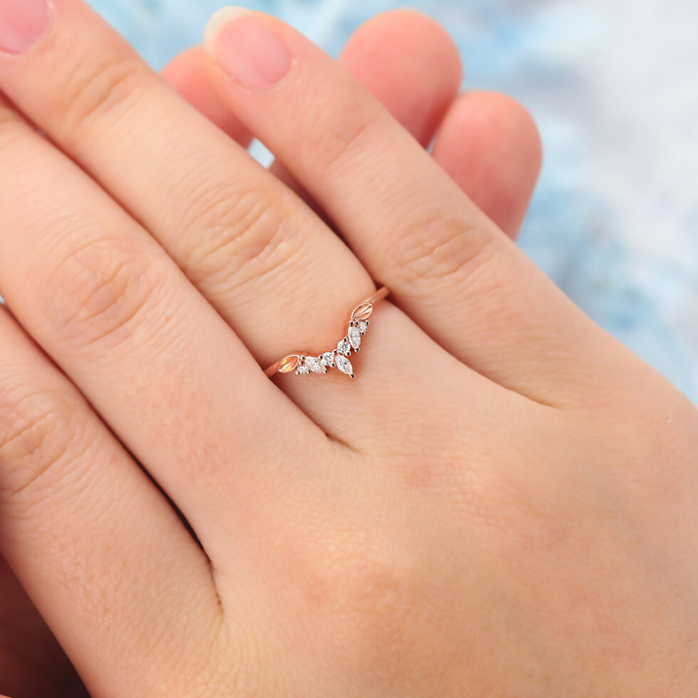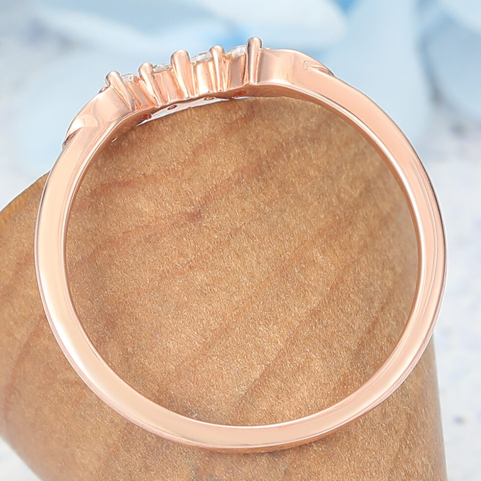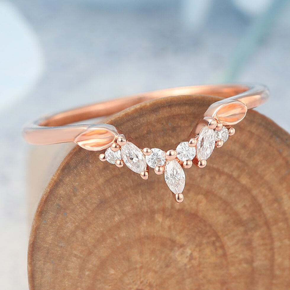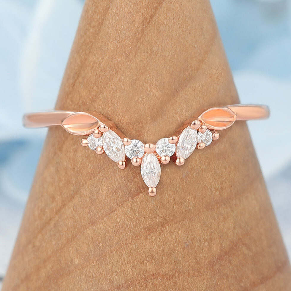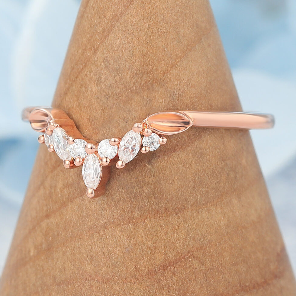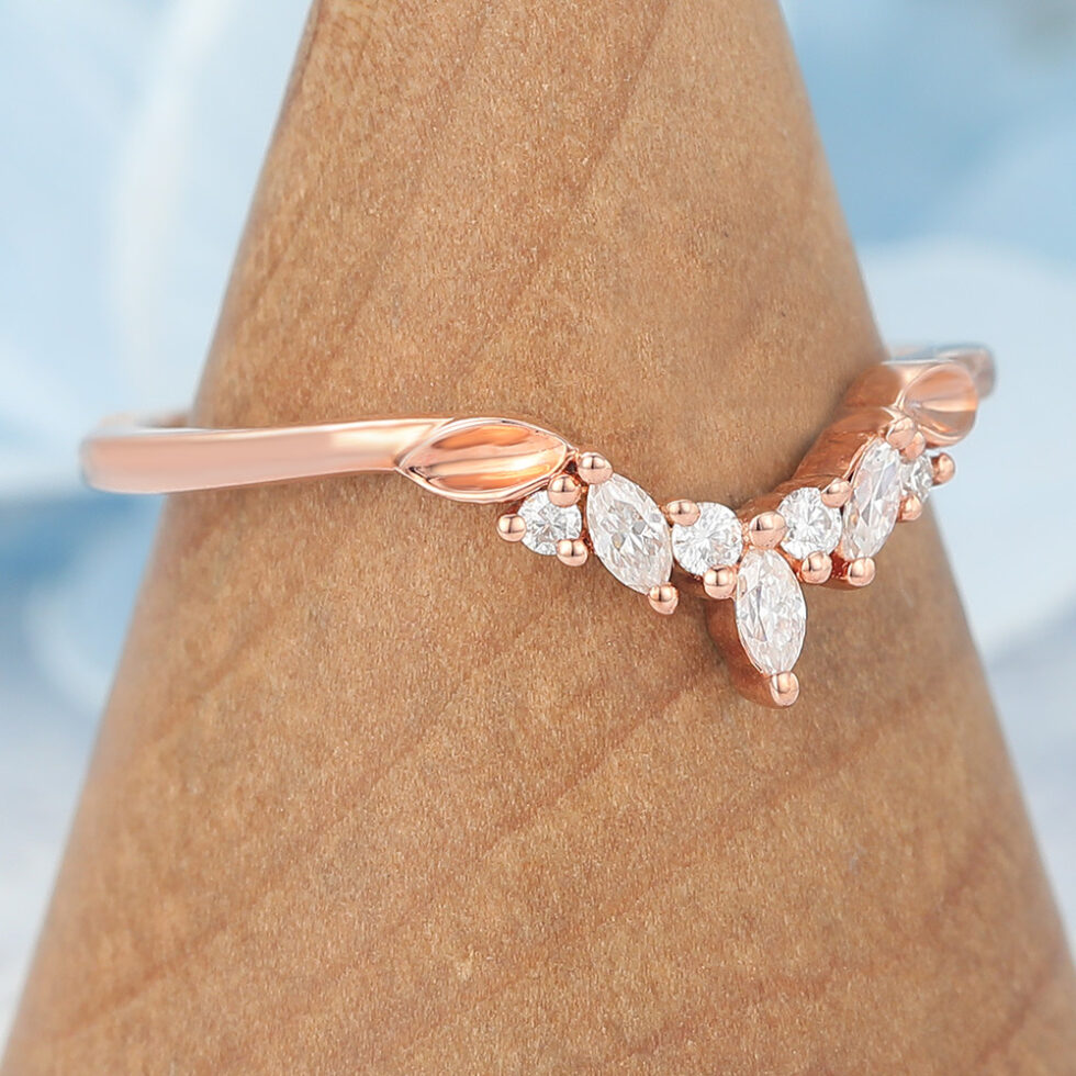 Moissanite Curved Wedding Band features marquise and round moissanites inlayed on curved rose gold band, which is a cheap moissanite wedding ring promise ring for women.