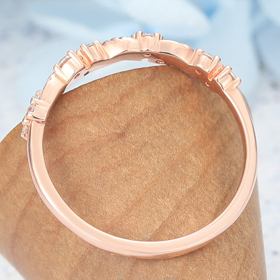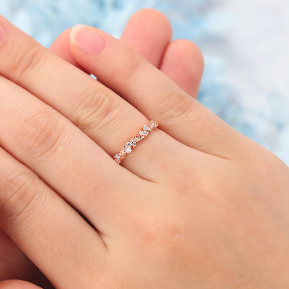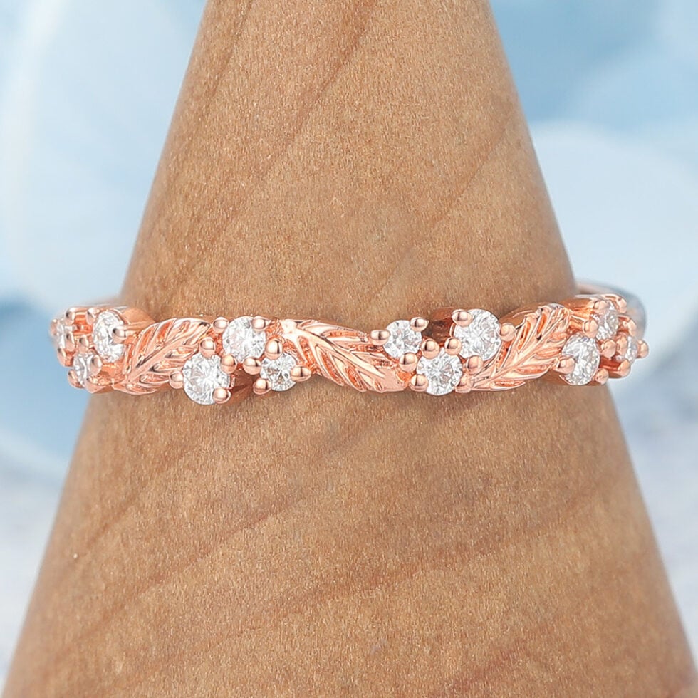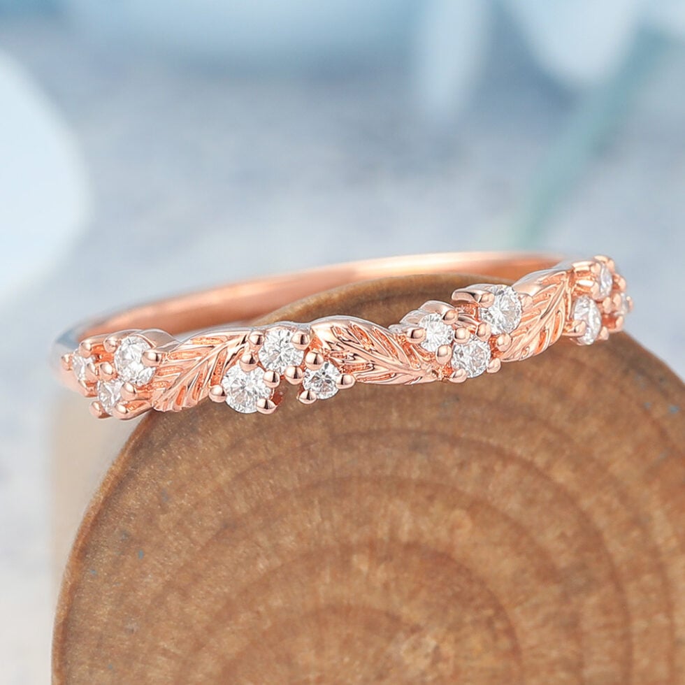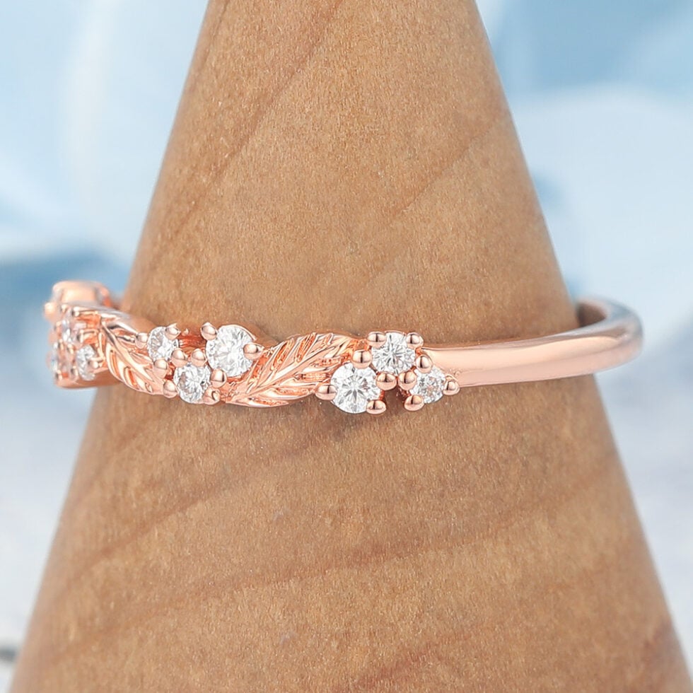 Nature-Inspired Wedding Band features rose gold leaf band and brilliant ,showing a moissanite wedding ring for ladies under $200.
