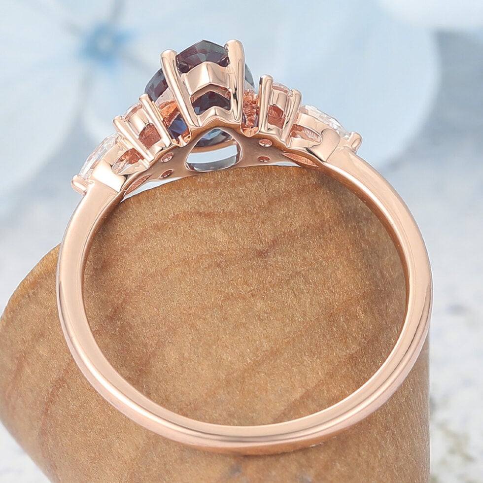 Rose Gold Pear Shaped Lab Alexandrite Engagement Ring puts a pear shaped lab blue alexandrite between two white round shaped moissanite on a rose gold band to form a unique and antique nature inspired alexandrite and moissanite engagement ring. Also the rose gold alexandrite engagement ring can also be used as wedding ring to show your love and promise for her.