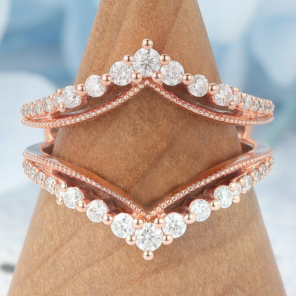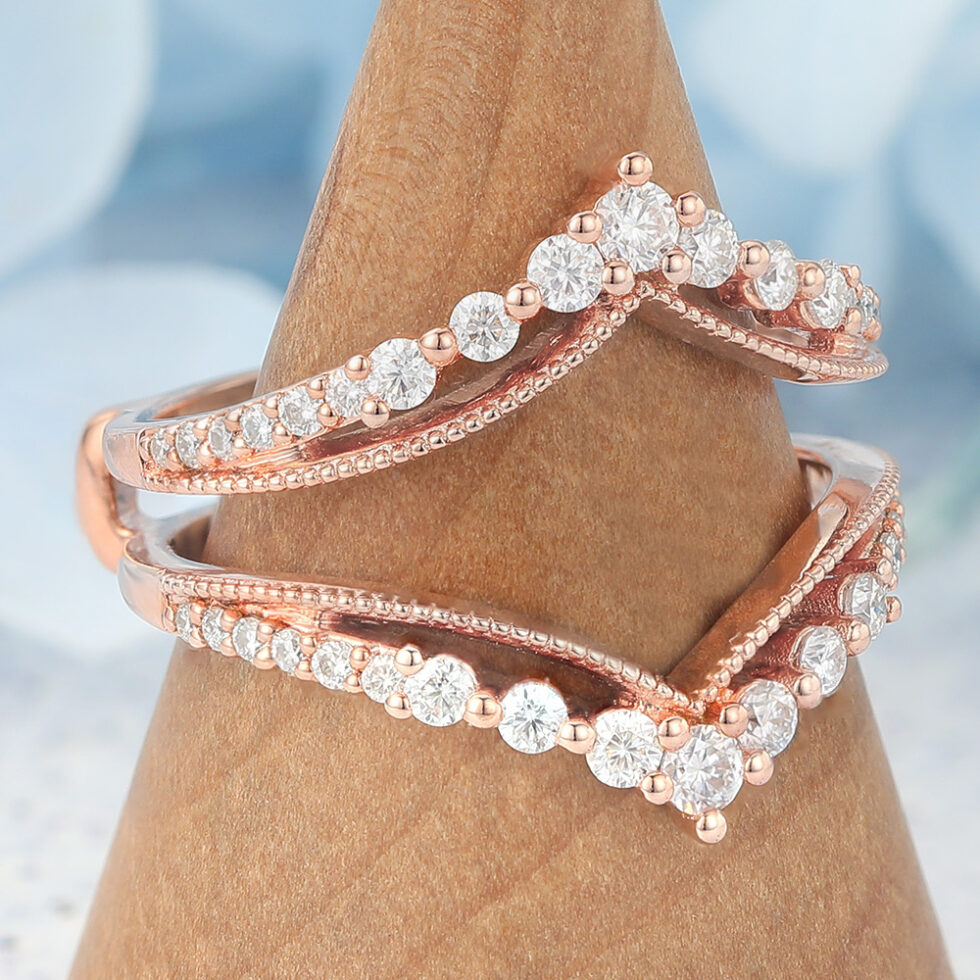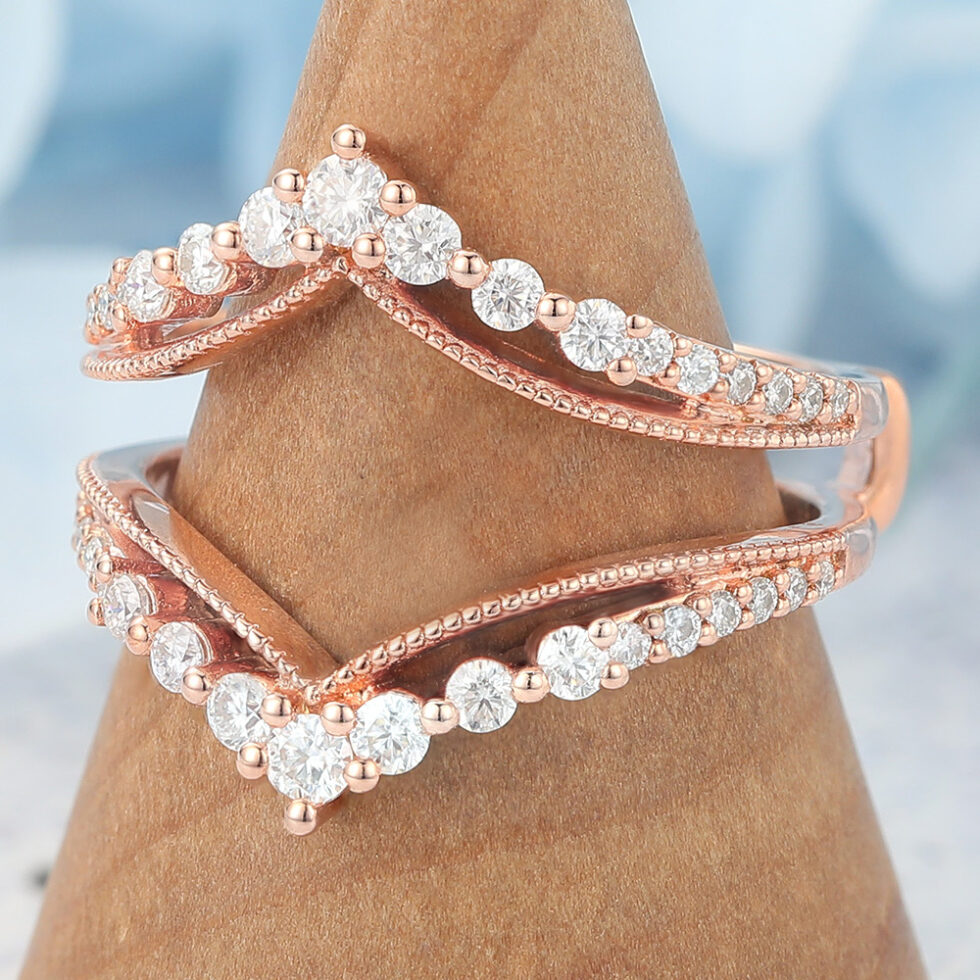 This vintage-inspired Round Moissanite Double Wedding Band Vintage Beaded Detail wedding band features a graceful double-curved silhouette, designed to pair seamlessly with low-profile engagement rings or stand out on its own. Sparkling round moissanites line the band, accented by intricate beaded milgrain detailing that evokes timeless charm.
