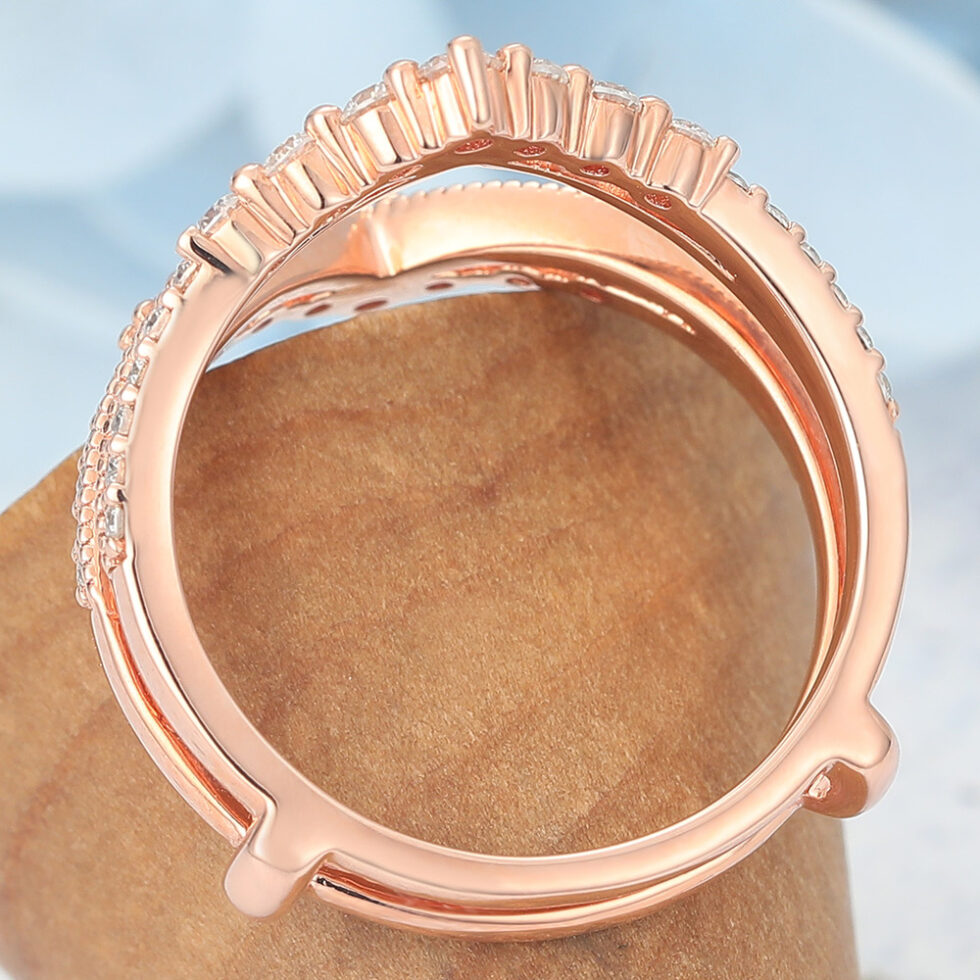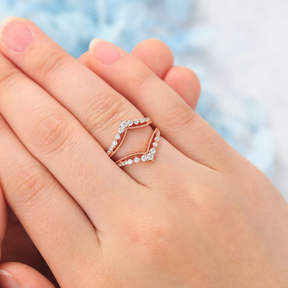 Round Moissanite Double Wedding Band is a unique double layer ring enhancer that inlayed small moissanites on it.